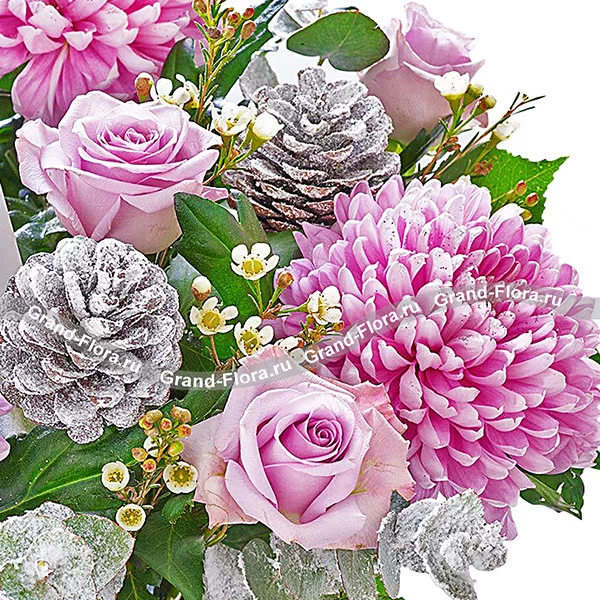 ДЕЛЮКС: хризантема одноголовая фиолетовая - 7 шт., роза Аква - 6 шт., эвкалипт декорированный серебром) - 4 шт., рускус - 4 шт., шишки (декорированные серебром) - 3 шт., бант фиолетовый.