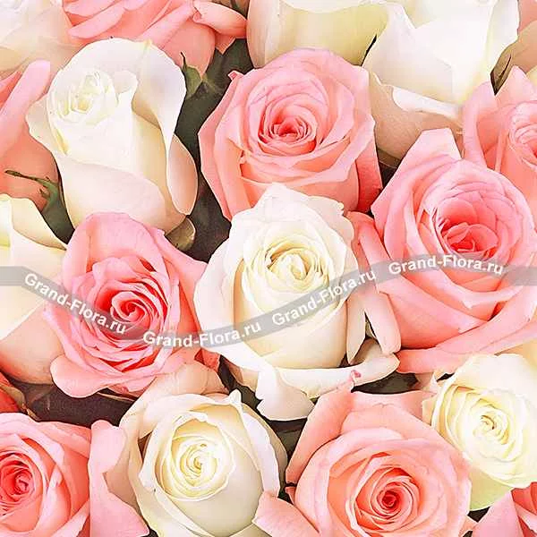 Букет белых роз и розовых роз (акционный букет, высота роз 40-50 см) Роза белая, роза розовая - 101 шт., упаковка, лента.